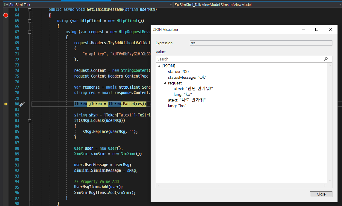 이렇게 Model과 ViewModel을 다 만들었습니다. 이러고 나서 GetSimSimiMessage()의 인자로 사용자의 메시지만 인자로 넘기게 되면 성공적으로 심심이의 메시지를 받아올 수 있을 것입니다. 한번 실행해 볼까요?