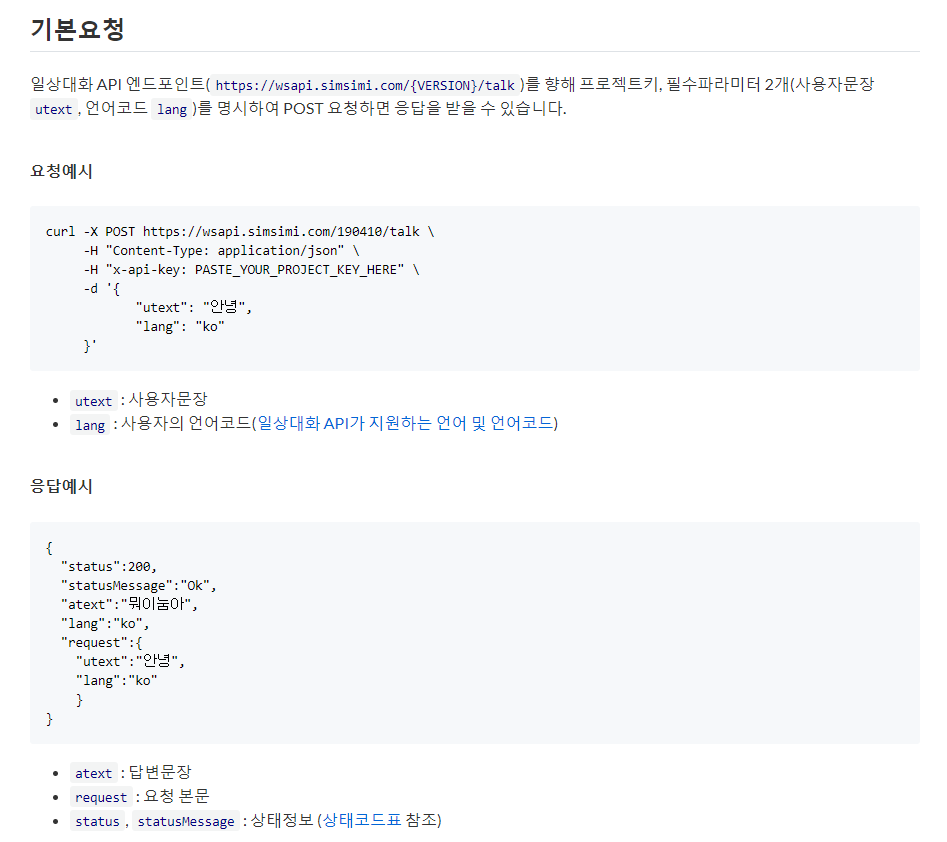 코드를 보기전에 요청 방법을 먼저 보도록 할게요. 저는 처음 이 요청 예시를 보았을 때 살짝 당황을 했습니다. 기존의 오픈 API의 요청이나 사용방법과 다르게 CURL 요청을 해야 했습니다. CURL이란 Client URL로 서버와 통신할 수 있는 커맨드 명령어 툴이었습니다. 기존 SimSimi API의 요청 방식을 보도록 할게요. 이것을 사용하려면 리눅스 또는 가상 머신 환경에서 패키지 관리 시스템을 통해 설치를 해야 했습니다.